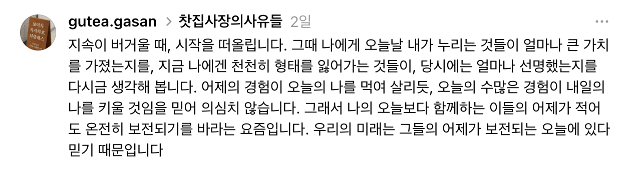 가장 바쁜 여름을 보내고 있습니다. 내가 여태까지 쌓아온 것들은 점차 형태를 갖춰가고 있고, 그와 동시에 무언가를 부지런히 쌓아가는 요즘입니다. 인간은 사회적 동물이라는 말의 의미도 새롭게 알아갑니다. 나자마자 몸을 자유롭게 움직일 수 있는 여타 동물들과는 다르게, 타인의 보살핌이 있어야만 생을 이어갈 수 있는 존재인 우리는 안전을 위해 함께함을 선택했는지도 모르겠습니다. 자려고 누웠을 때 마음에 걸리는 게 없는 것이 행복이라는 혹자의 말처럼, 볼 수도 만질수도 없는 행복을 찾는 선택일 수도 있겠습니다. 수많은 가설 속에서 나는 그저 무탈함이라는 단어만을 붙잡아봅니다. 그렇게 함께 하는 이들의 무탈함만을 바라봅니다. |
